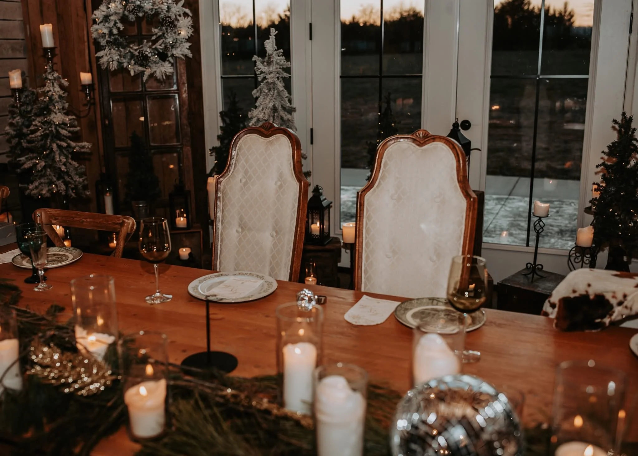 Outdoors, our spacious stamped concrete patio is lined with string lighting suspended from poles, casting a magical glow as the sun sets. The horizontal wire railing keeps the view wide open, allowing guests to fully enjoy the surrounding landscape. We also proudly allow live flame candles throughout the venue, which, when paired with greenery like eucalyptus garlands, add an enchanting, timeless ambiance.