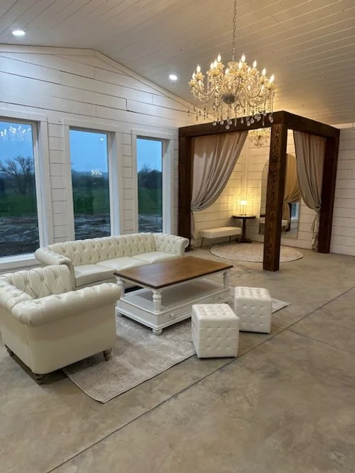 One of our standout features is the private 1,500-square-foot building dedicated entirely to the bridal suite and groom’s quarters. The bridal suite is a luxurious, light-filled space featuring custom chandeliers, private closets, and a breathtaking 5-foot by 8-foot ornate mirror that’s perfect for bridal portraits. Just down the hall, the groom’s quarters offer a relaxed yet refined setting with a large-screen TV, game table, bar area, and separate bathroom and closet—giving both parties plenty of space to prep, relax, and enjoy the day in comfort and style.